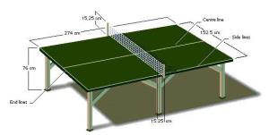 Lapangan tenis meja dibagi menjadi dua bagian yang dipisahkan oleh jaring dengan tinggi 15,25 cm dan panjangnya 183 cm. Tinggi meja tenis adalah 76 cm, panjang meja adalah 274cm dan lebar 152 cm