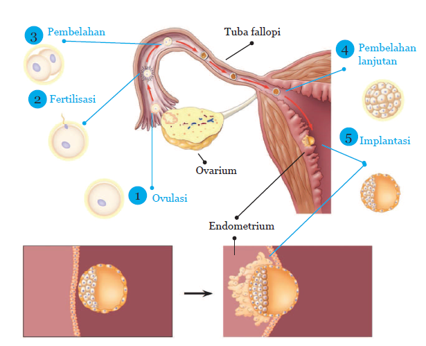 Fase ketiga adalah fase sekretori. Folikel yang telah melepaskan sel telur akan berubah menjadi korpus luteum. Sel telur yang telahterjadi fertilisasi), maka akan dikirimkan sinyal tertentu pada korpus luteum untuk tidak memproduksi hormon estrogen dan progesteron lagi. Dengan demikian, pada fase ini jumlah hormon estrogen dan progesteron pada perempuan rendah. Rendahnya hormon estrogen dan progesteron menyebabkan jaringan penyusun dinding rahim rusak dan pembuluh darah yang ada pada dinding rahim pecah, sehingga perempuan akan mengalami menstruasi.6. Fertilisasi dan KehamilanFertilisasi merupakan proses peleburan inti sel sperma dan sel telur sehingga membentuk zigot. Proses ini terjadi di tuba fallopi.Zigot yang terbentuk setelah terjadinya fertilisasi akan melakukan pembelahan, selanjutnya berkembang menjadi embrio yang akan menuju ke rahim kemudian tertanam (implantasi) ke dalam